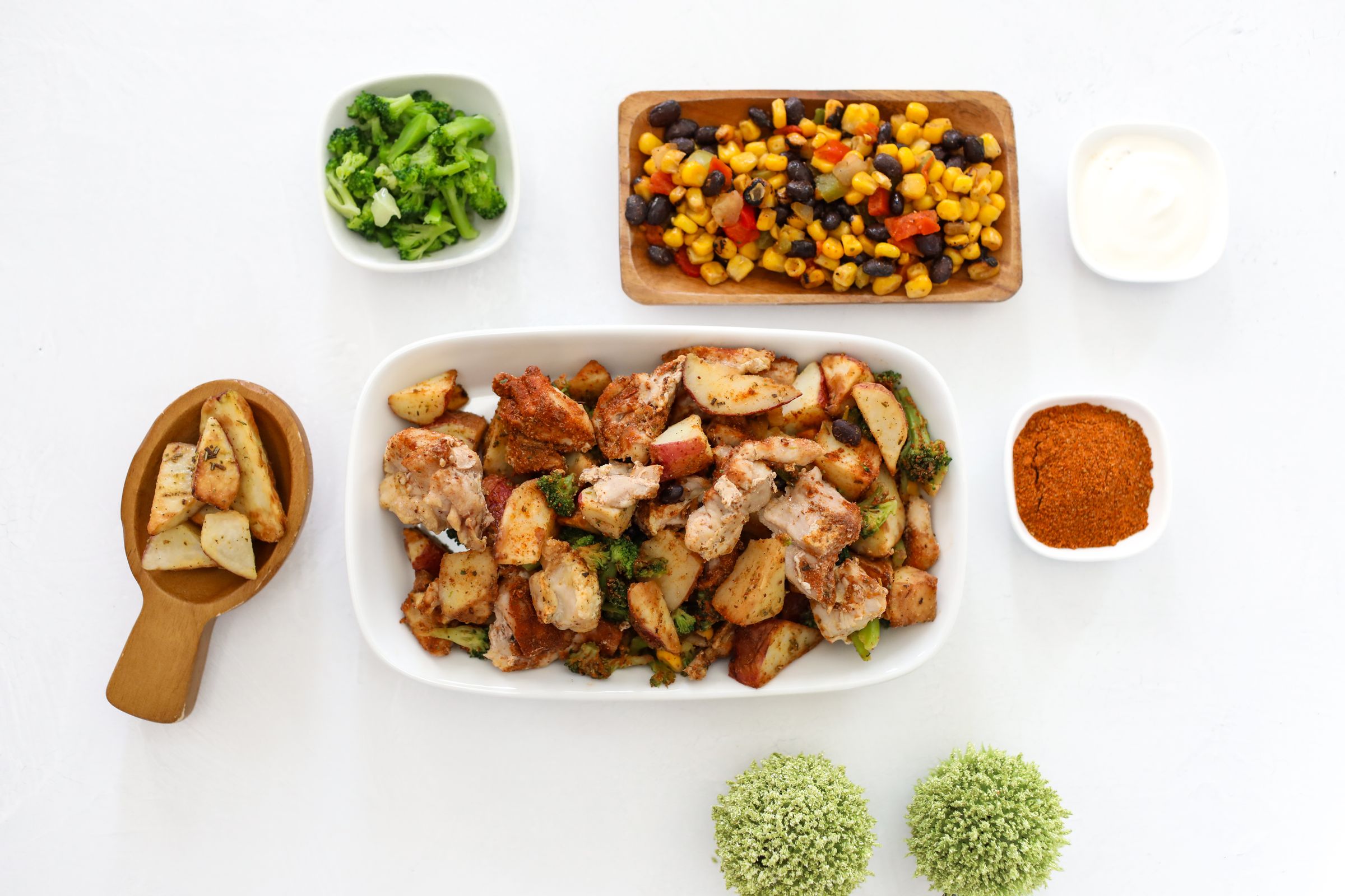 Our Chesapeake Chicken features tender, juicy chicken thighs perfectly seasoned with Old Bay and our signature Visionary Seasoning. Served with roasted baby baker potatoes, a colorful medley of corn and black beans, crisp-tender broccoli, and a side of creamy sour cream, this dish is sure to please all your senses!