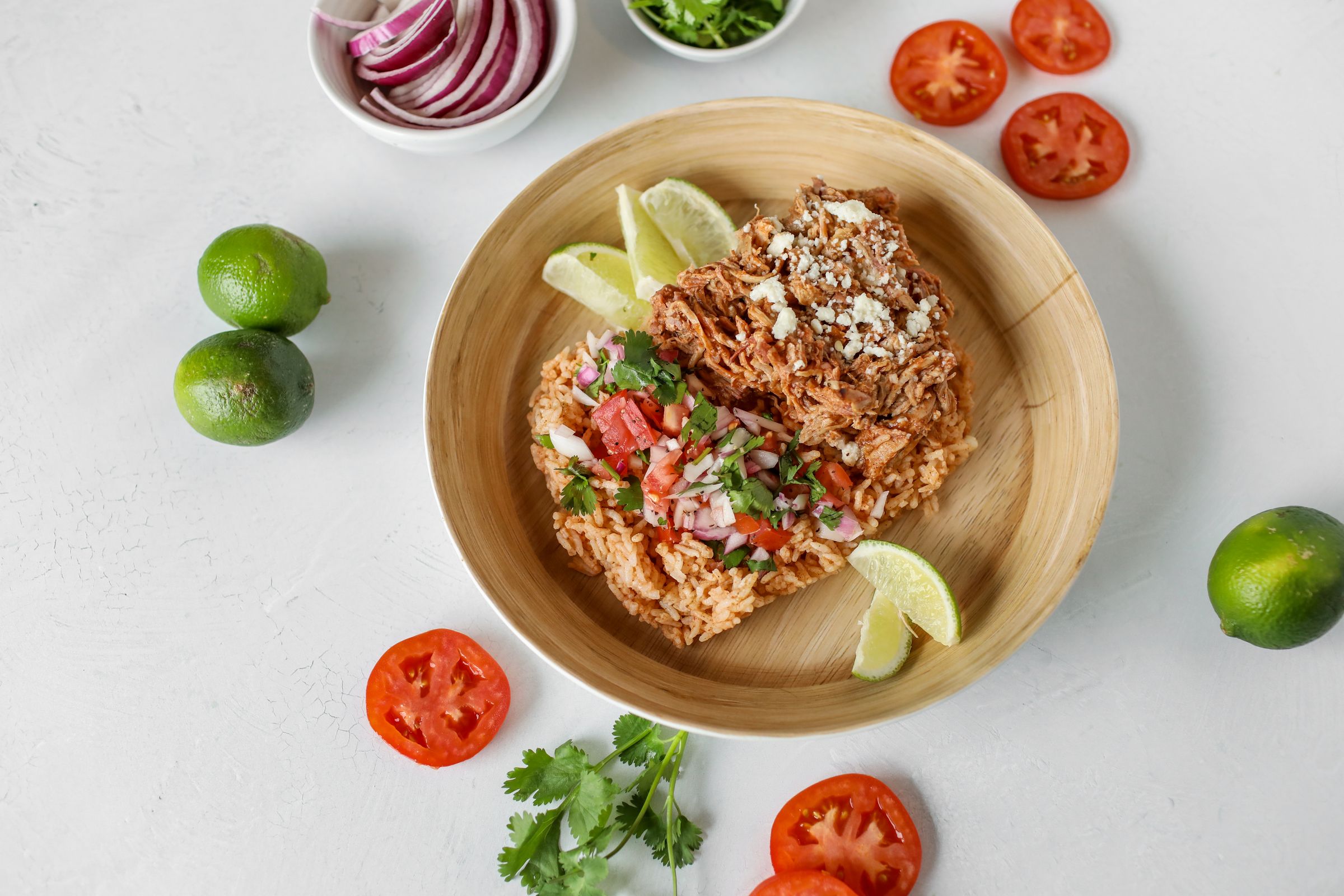 In this tantalizing birria pork taco bowl, succulent shreds of slow-cooked pork are marinated in the perfect amount of spices. Nestled atop a bed of fluffy Spanish rice, the pork harmonizes beautifully with the earthy flavors of the grains, creating a symphony of tastes and textures. A vibrant medley of pico de gallo, boasts ripe tomatoes, fragrant cilantro, and a hint of lime juice, all finished off with queso fresco for a cheesy and creamy topping.