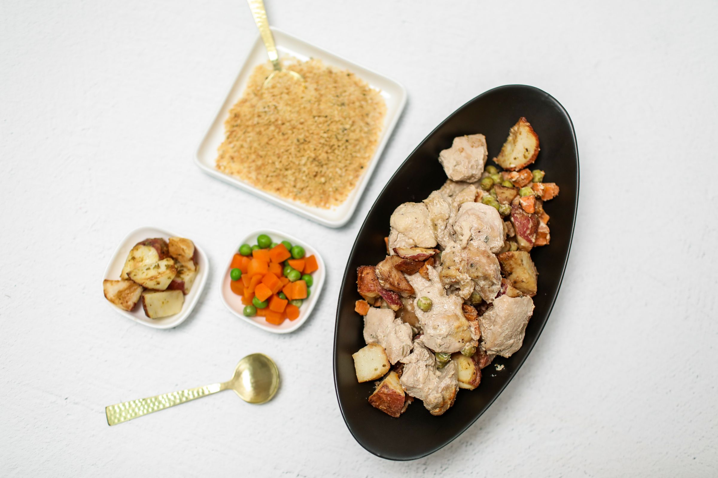 This comforting twist on a classic chicken pot pie features a golden, crispy breadcrumb crust instead of the traditional pastry. Tender chunks of slow-cooked chicken, sweet carrots, peas, and hearty potatoes are enveloped in a rich, creamy sauce, seasoned to perfection with thyme and rosemary herbs. Instead of a traditional pie crust, a generous layer of buttery, toasted breadcrumbs add a deliciously crunchy contrast to the creamy filling. Baked until bubbling and golden brown, this easy-to-make, rustic take on chicken pot pie delivers all the cozy flavors you love—with lower calories & plenty of great nutrients!