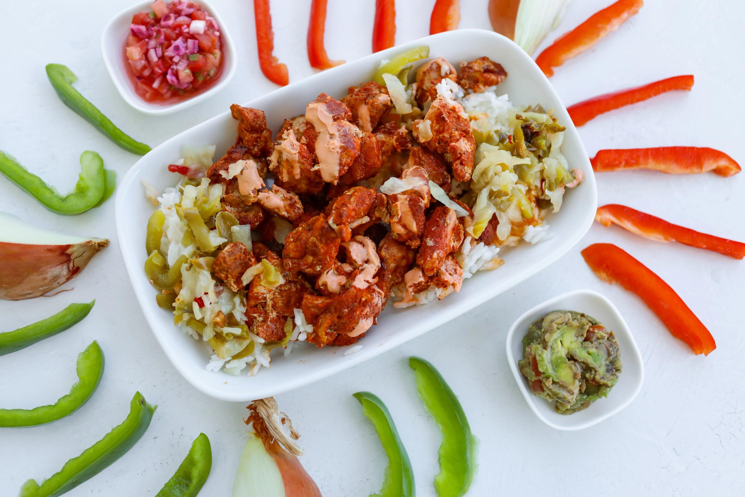 Our Chipotle Chicken Bowl is a flavor-packed delight, featuring chipotle-styled chicken thighs that lock in the savory flavors of the dish. Served atop fluffy jasmine rice & accompanied by a colorful pop of mixed peppers & onions & finished with a dollop of creamy guacamole, this dish is perfectly balanced with spicy & creamy flavors.