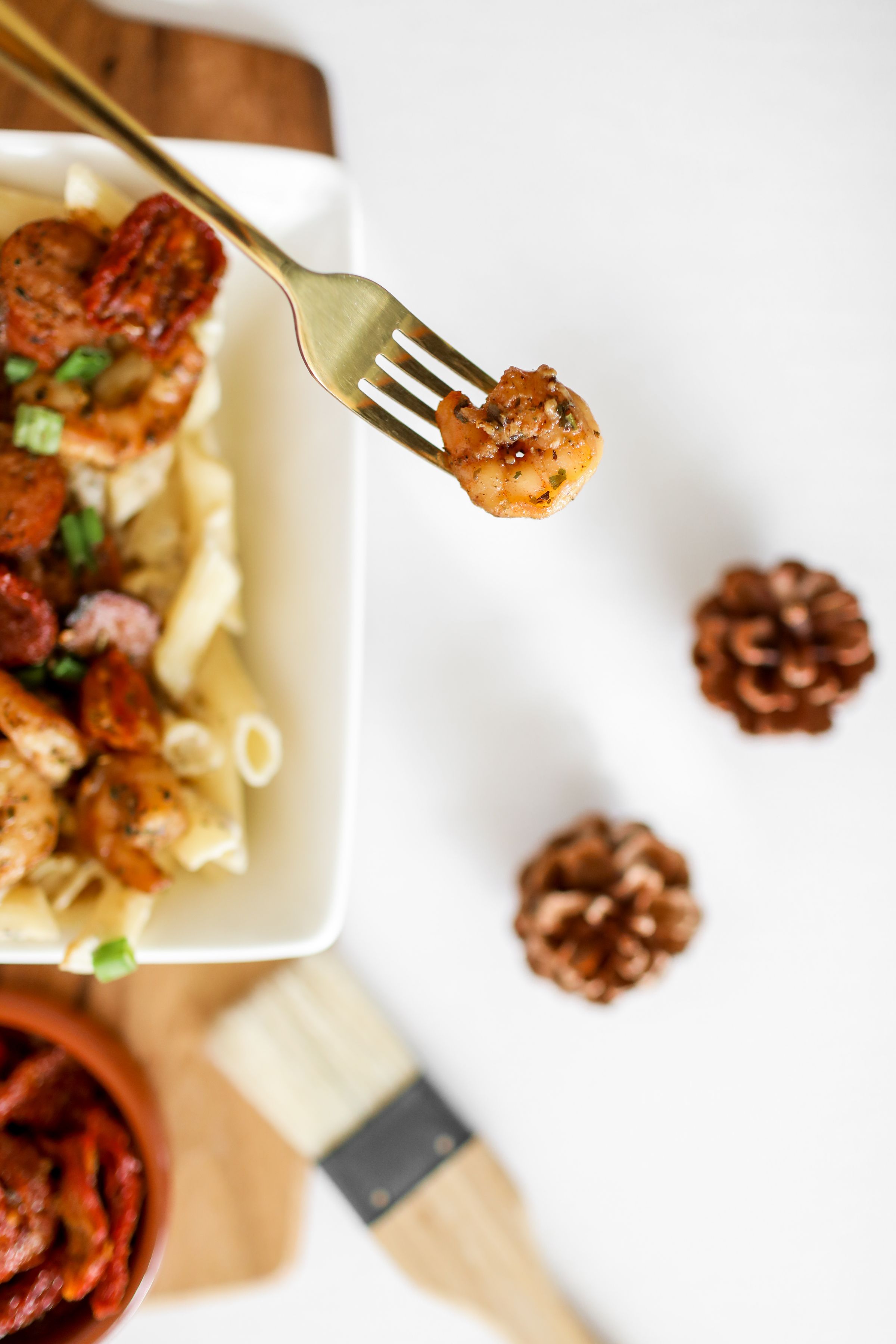 Indulge in a rich and savory fusion of land and sea with our Shrimp & Kielbasa Alfredo! Tender shrimp and smoky slices of kielbasa are simmered in a velvety Alfredo sauce infused with garlic, butter, and sun-dried tomatoes. Served over velvety pasta, it’s a flavorful, indulgent meal that satisfies every craving!