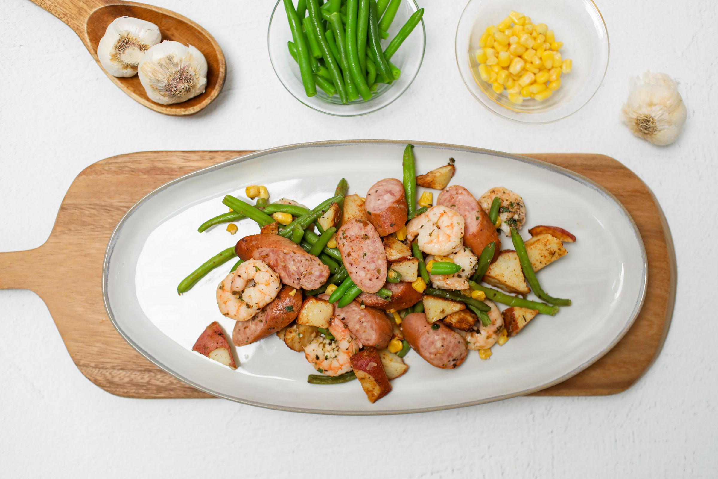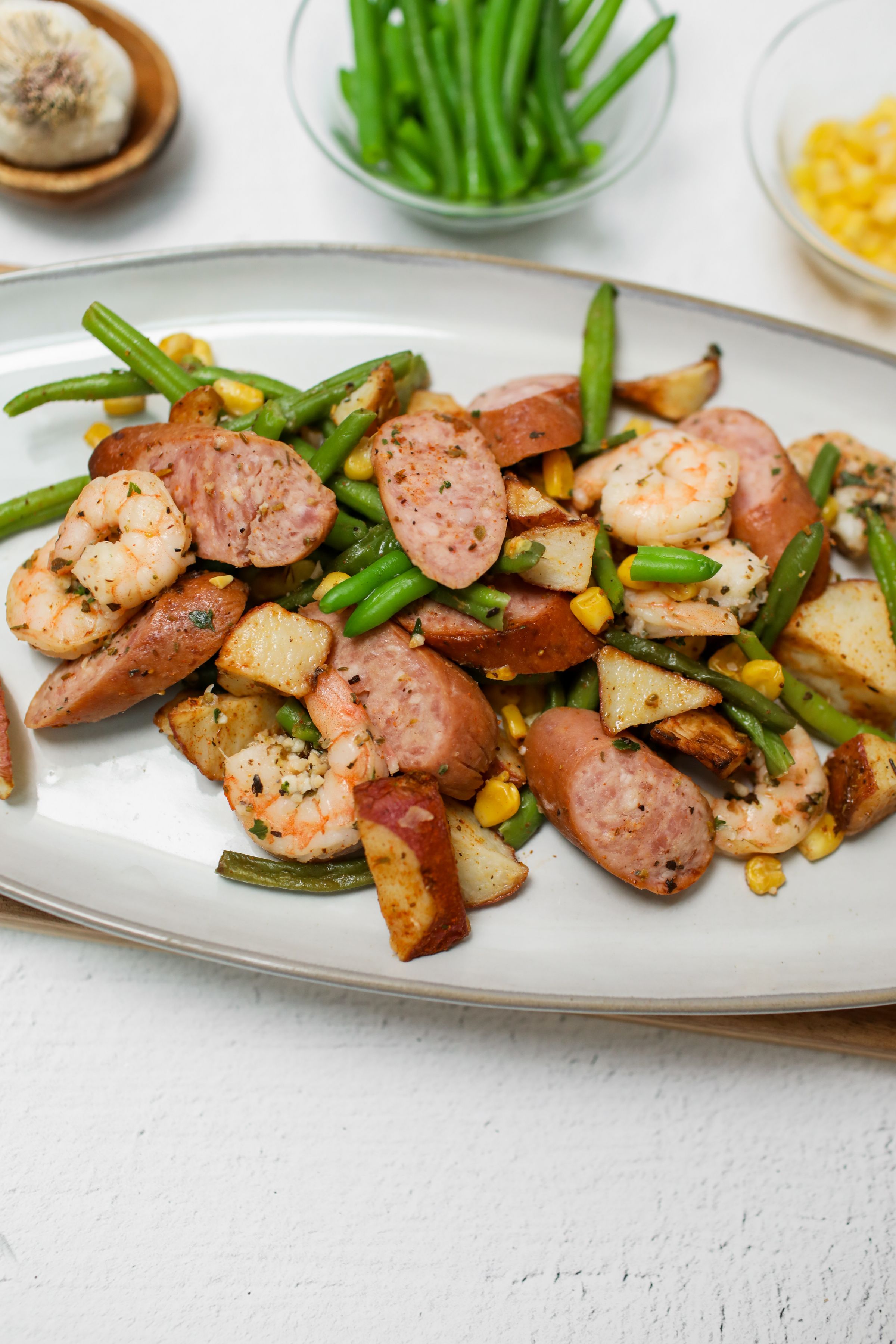 Get ready to dive into a zesty, bold Creole Shrimp and Kielbasa dish that’ll pack a punch! Succulent shrimp and savory kielbasa are cooked to perfection with a mouthwatering blend of Creole seasoning. The dish is finished with a sprinkle of Old Bay, adding an irresistible coastal twist. To make it even better, you’ve got a hearty, colorful side of sweet corn, crisp green beans, and tender redskin potatoes, making every bite a well-rounded, comforting experience!