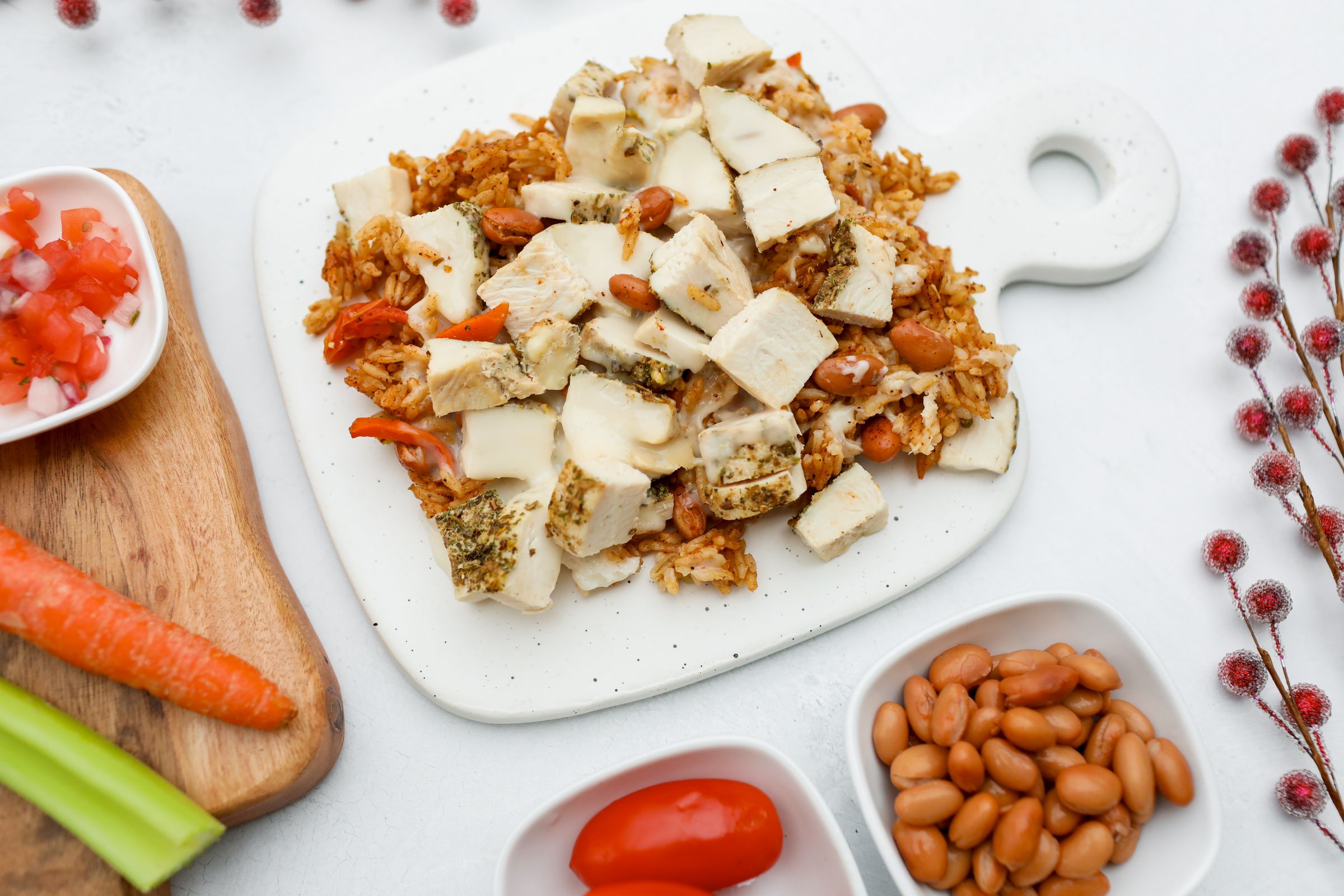 Juicy, boldly seasoned chicken meets hearty, flavor-packed Spanish rice for a warm, Southwest-style comfort bowl. A silky drizzle of creamy queso adds just the right richness, while fresh Pico brings a bright, zesty pop to every bite. Smoky, creamy, and perfectly balanced, this is a satisfying meal that keeps you fueled and feeling good.