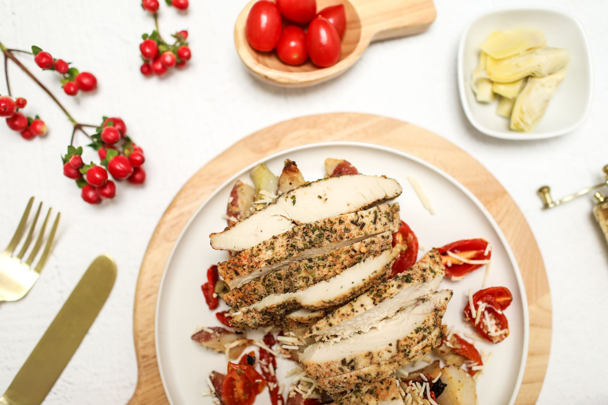 This Garden Chicken dish features tender chicken breast & a roasted vegetable medley for a light, satisfying dish with a variety of textures. This balanced and hearty meal tastes both fresh and comforting to fuel your day ahead!