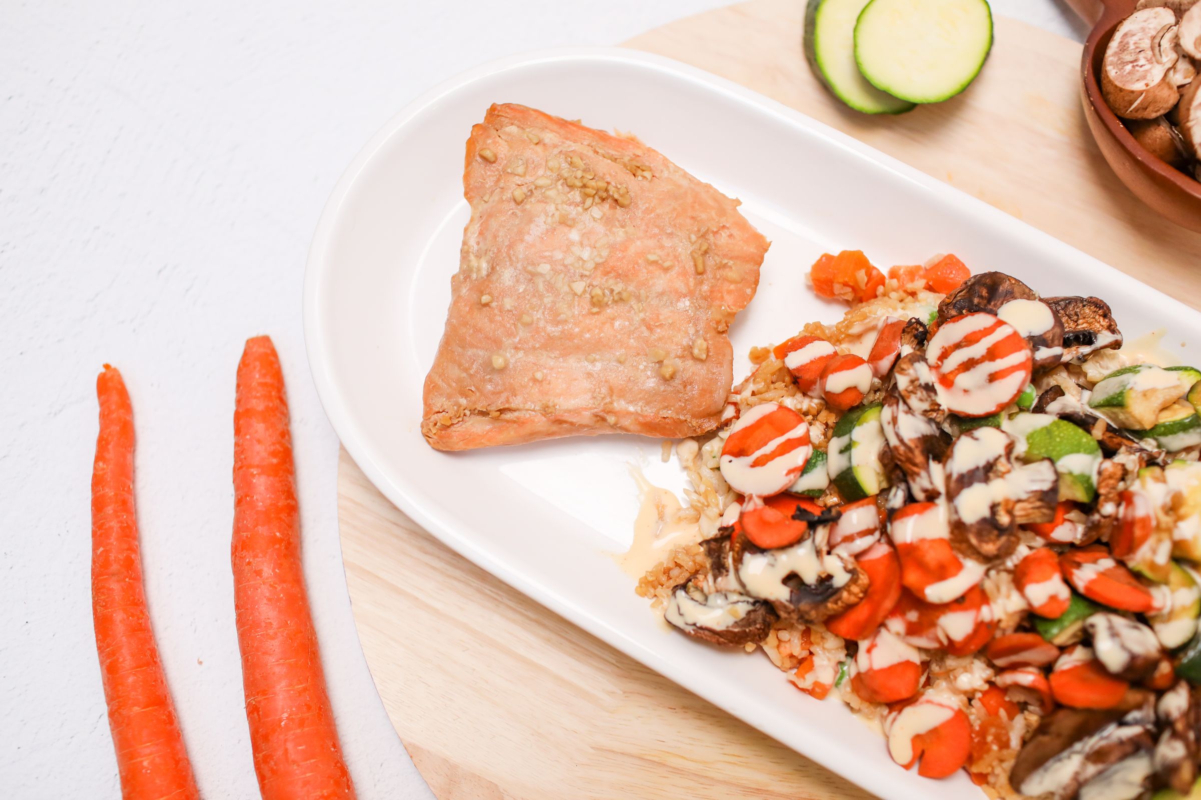 Experience the sizzle and aroma of our Hibachi Salmon Bowl, featuring tender salmon cooked to perfection, served alongside a bed of flavorful fried rice, & infused with a colorful mix of carrots, zucchini, and mushrooms. Creamy Yum Yum sauce adds the perfect tangy & savory kick, where each spoonful offers a delightful medley of textures and flavors!
