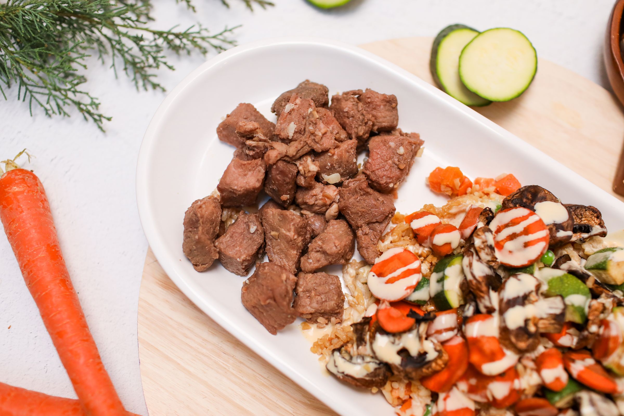 Experience the sizzle and aroma of our Hibachi Steak Bowl, featuring tender and juicy steak cooked to perfection, served alongside a bed of flavorful fried rice, & infused with a colorful mix of carrots, zucchini, and mushrooms. Creamy Yum Yum sauce adds the perfect tangy & savory kick, where each spoonful offers a delightful medley of textures and flavors!