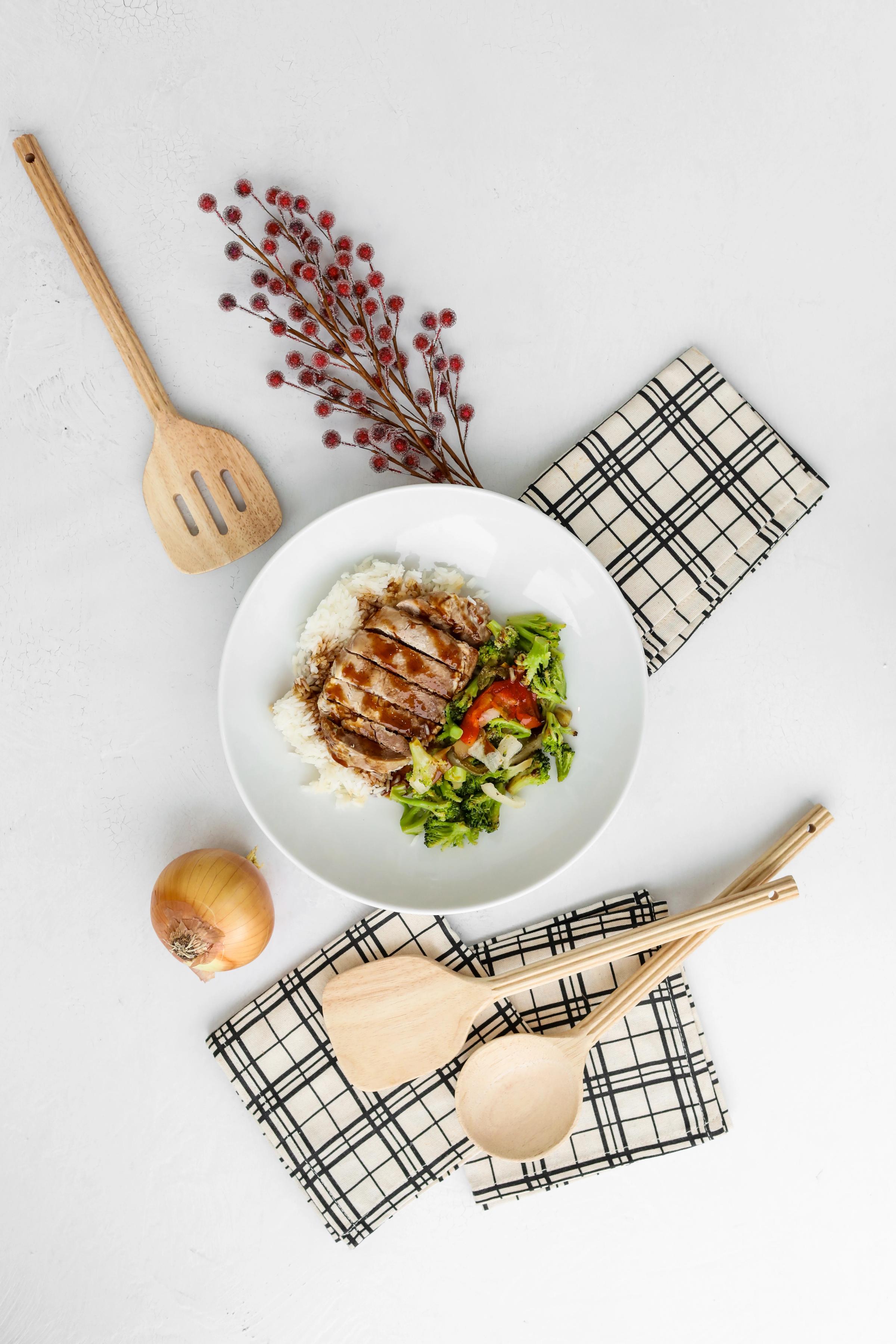 Our sweet honey-hoisin char siu glaze coats tender pork chops, served with fluffy rice, crisp broccoli, and sautéed vegetables. This well-balanced dish is full of simple ingredients & bold flavors to fuel your day!