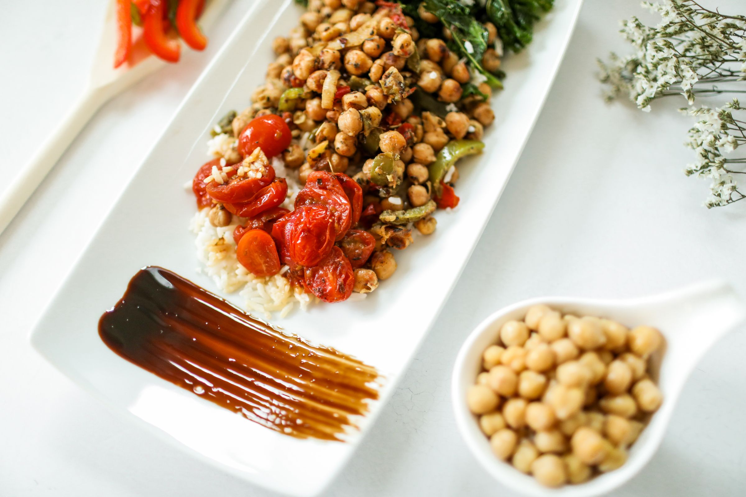 Delight your taste buds with our plant-based Italian Chickpea Bowl, where perfectly seasoned chickpeas mingle with colorful roasted vegetables, fluffy jasmine rice, and a savory balsamic glaze. This is a Mediterranean-inspired culinary masterpiece that brings together robust flavors and wholesome ingredients in every mouthful.