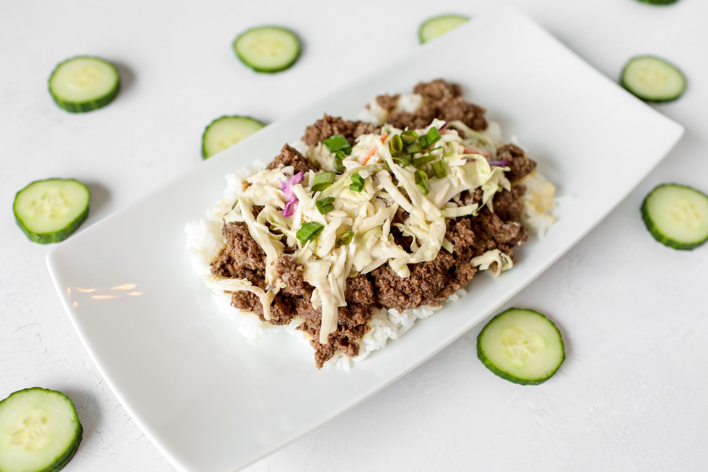 Indulge in the exquisite flavors of Korean cuisine with the tantalizing Korean Beef Bowl. Imagine deliciously-flavored ground beef, marinated in a symphony of coconut aminos, garlic, and ginger, delivering a savory punch with every bite. Nestled atop the Korean beef is a vibrant medley of cabbage mix, offering a delightful crunch and freshness that perfectly complements the rich flavors of the dish. Finished with bright green onions, sesame seeds, & pickled cucumbers, this will leave you with the perfect finishing crunch.