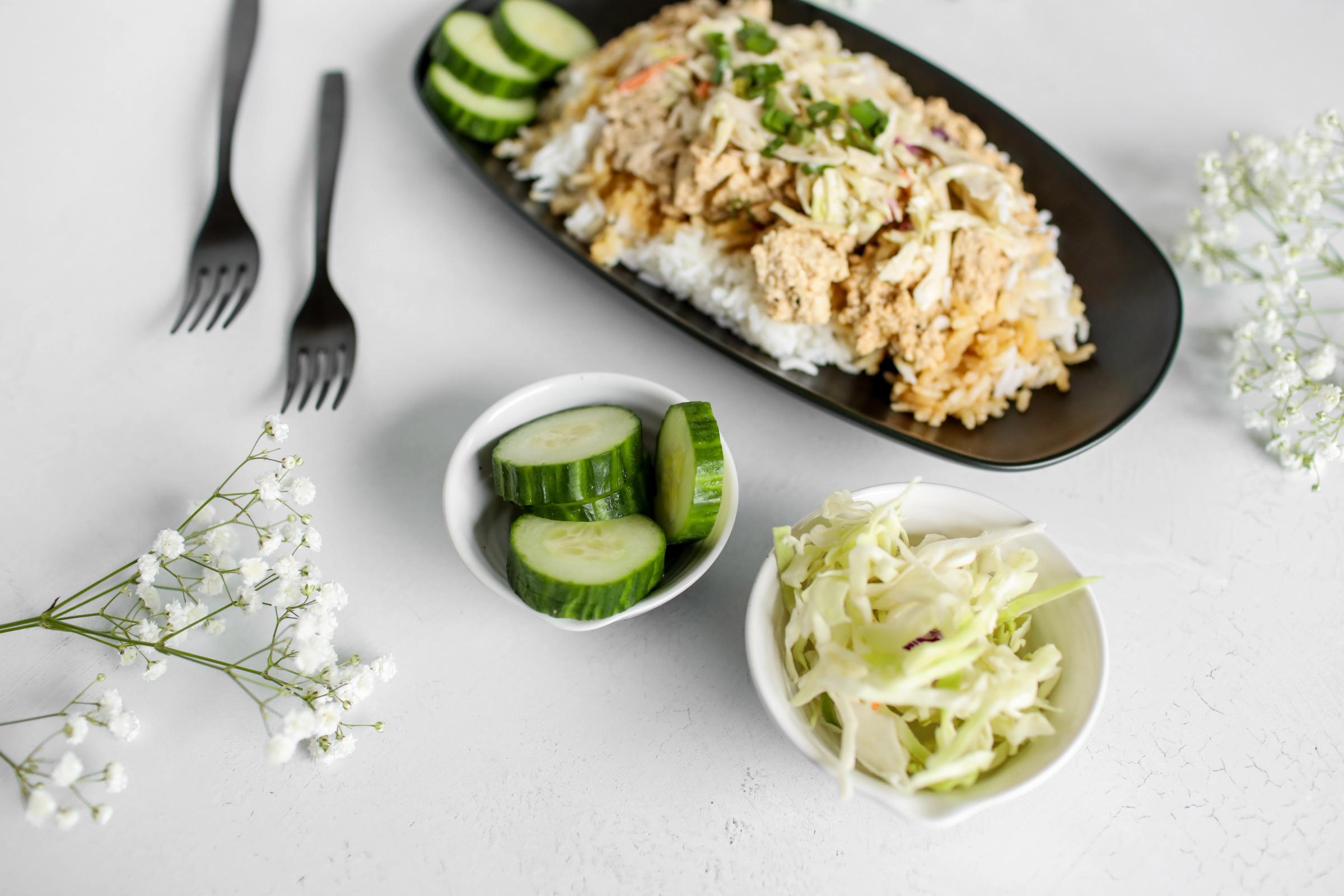 Indulge in the exquisite flavors of Korean cuisine with our tantalizing Korean Tofu Bowl. Imagine deliciously flavored tofu, marinated in a symphony of coconut aminos, garlic, and ginger, delivering a savory punch with every bite. Nestled atop the protein is a vibrant medley of cabbage mix & pickled cucumbers, offering a delightful crunch and freshness that perfectly complements the rich flavors of the dish.