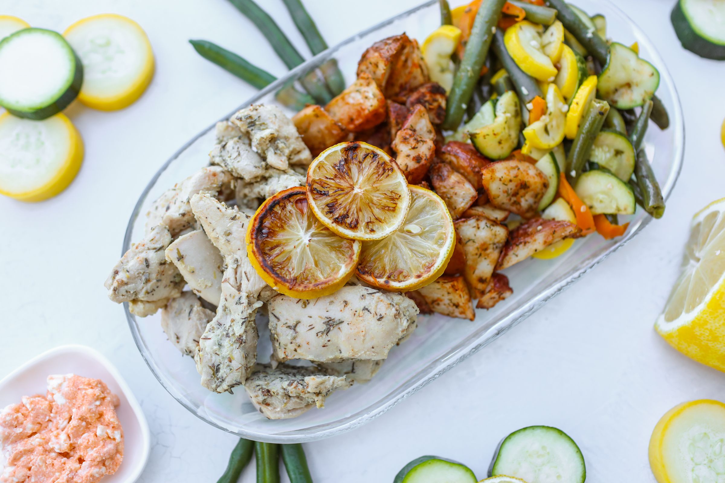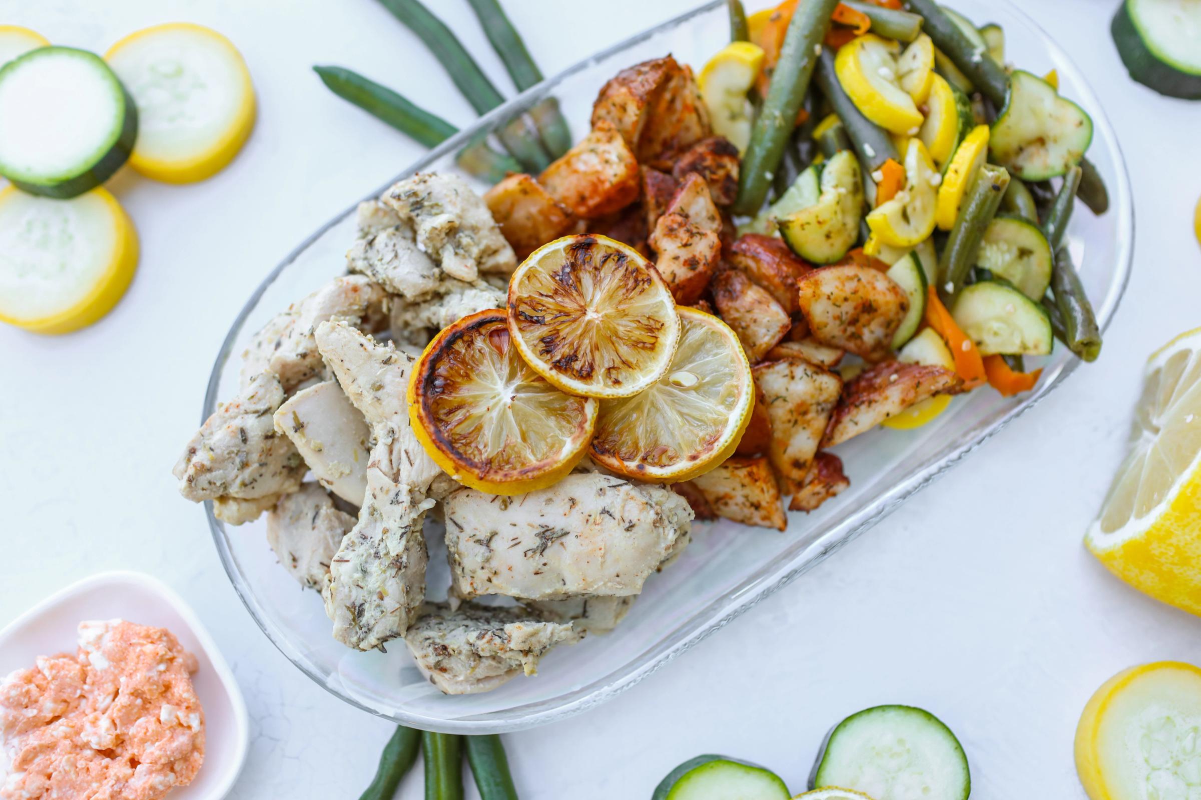Tender herb-roasted chicken is served alongside a vibrant mix of roasted zucchini, yellow squash, bell peppers, green beans, and seasoned red skin potatoes. Finished with a zesty slice of roasted lemon for a bright, fresh touch, this meal is balanced, wholesome, and full of comforting flavors that will nourish your body and soul!