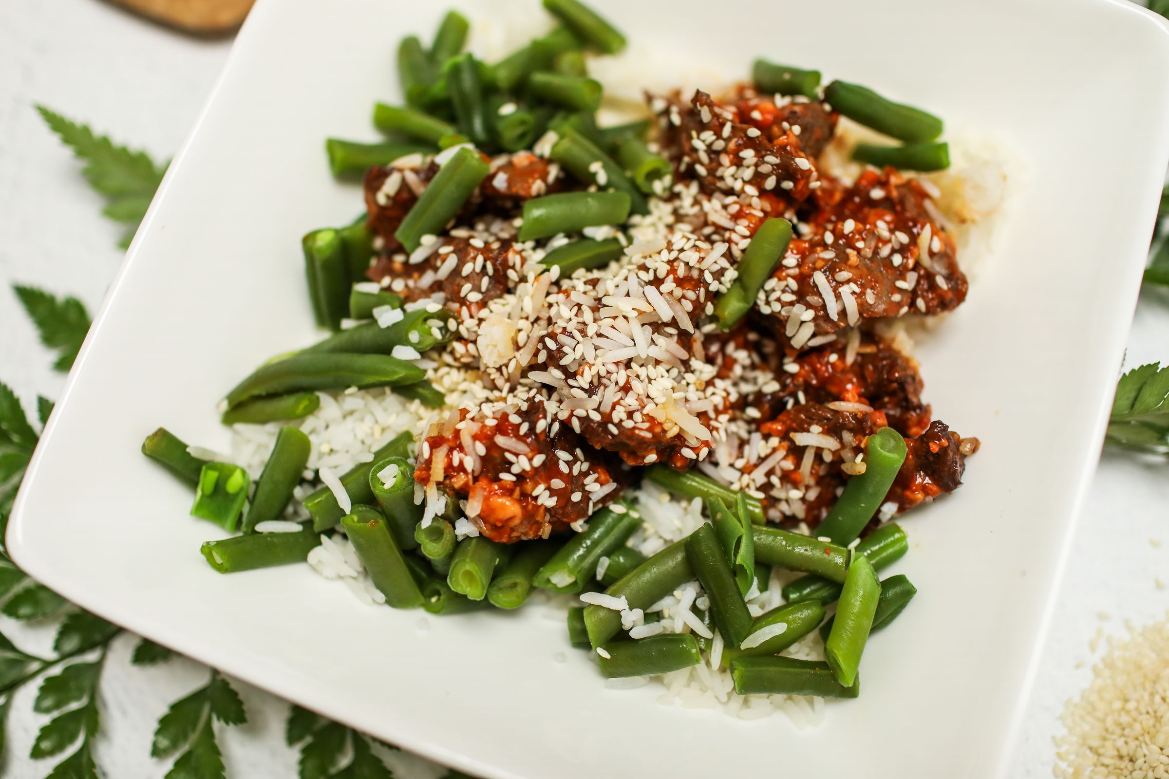 This dish offers a unique, flavorful twist on the classic Chinese dish, blending the savory notes of traditional Mongolian beef with the complexity of coconut aminos and Gochujang. The rich, umami-packed sauce, tenderness of the beef, and nutty crunch of the sesame seeds make each bite deeply satisfying & filling!