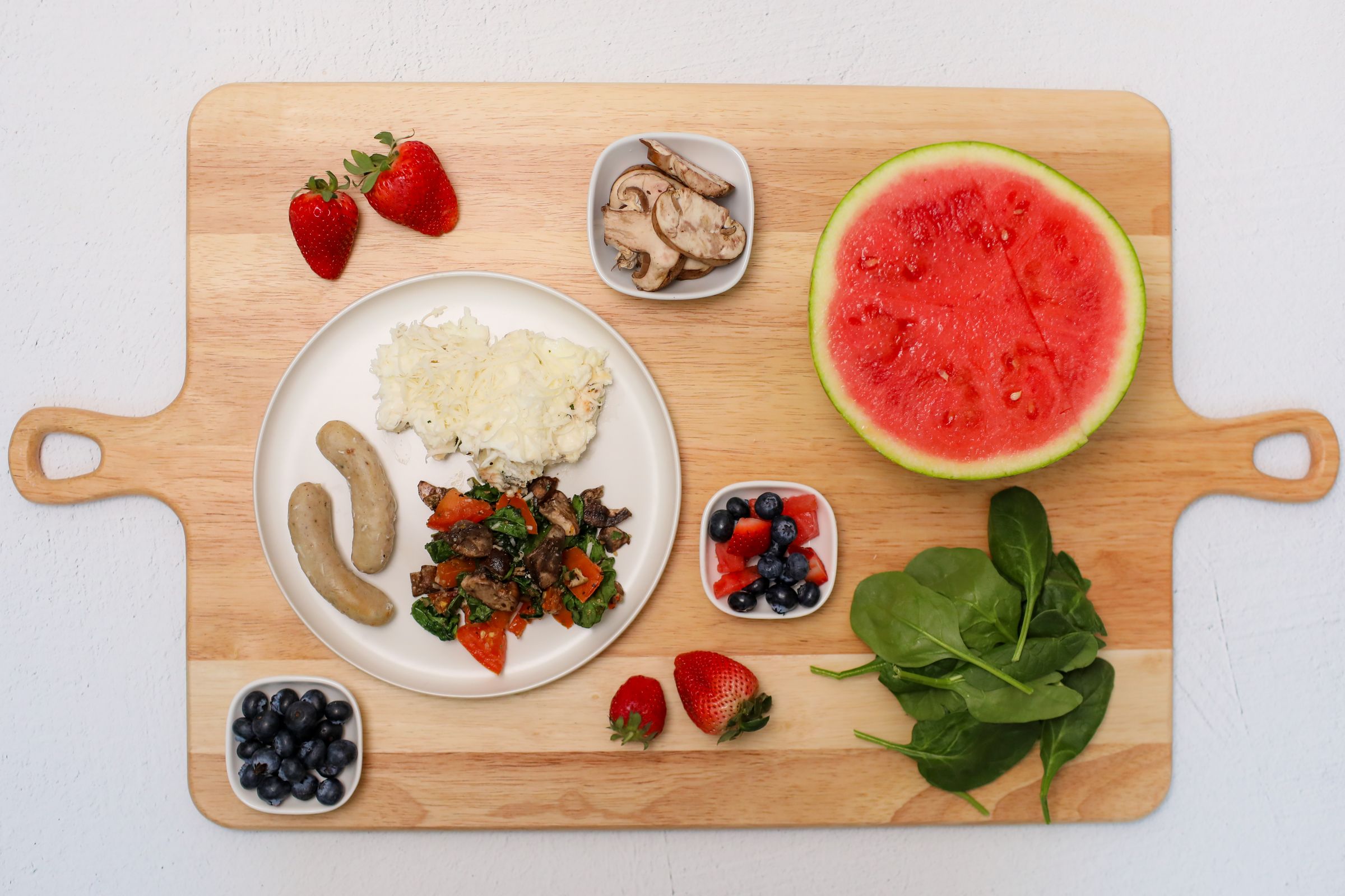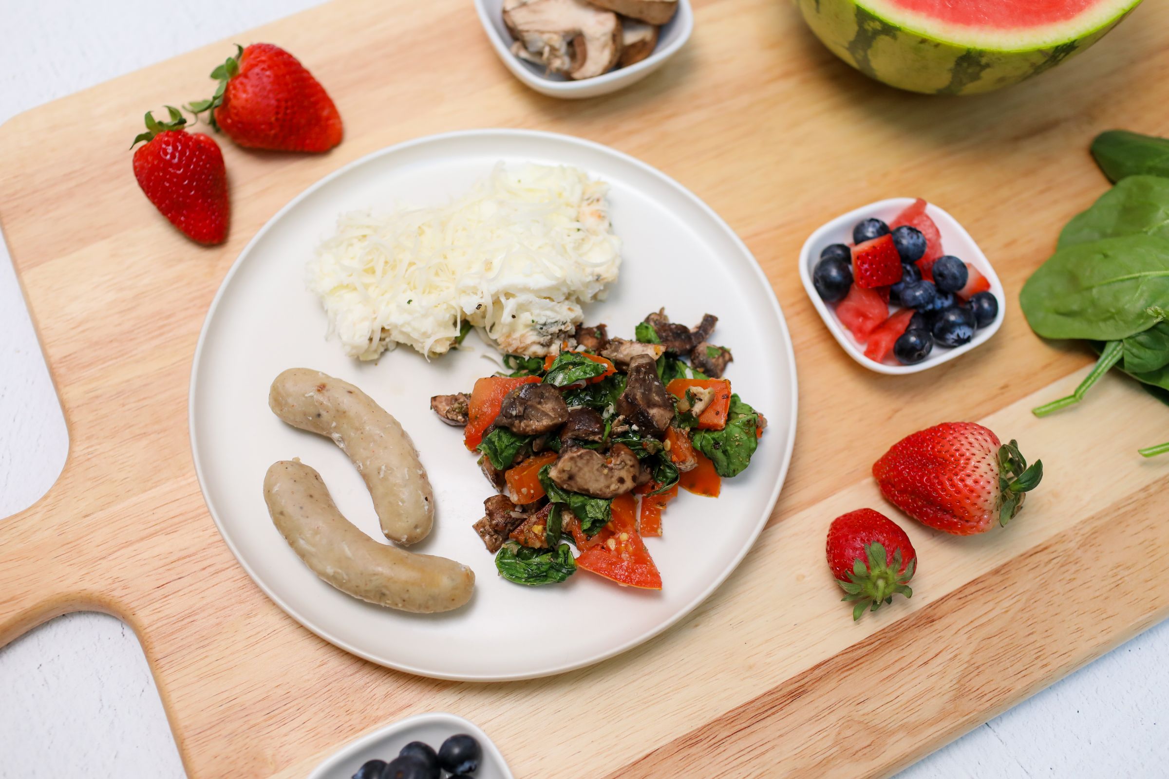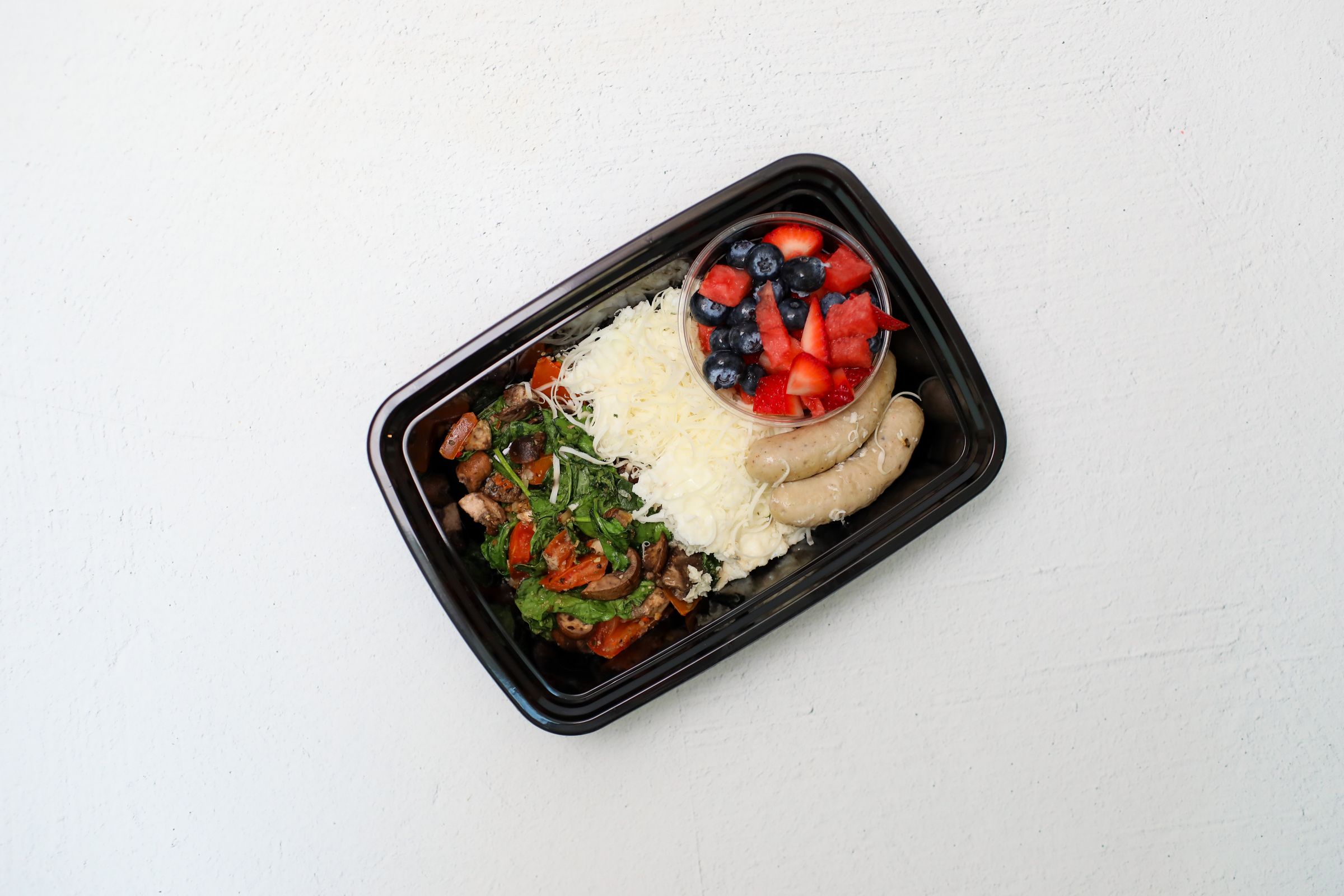 Start your day right with our Parmesan Breakfast Scramble! Light, fluffy egg whites are scrambled with rich parmesan cheese and paired with savory chicken sausage, sautéed mushrooms, spinach, and juicy tomatoes. A refreshing fruit cup of strawberries, watermelon, and blueberries adds the perfect sweet touch. Finished with a sprinkle of parmesan, this dish is a delicious balance of savory, sweet, and satisfying—your perfect breakfast to fuel the day ahead!