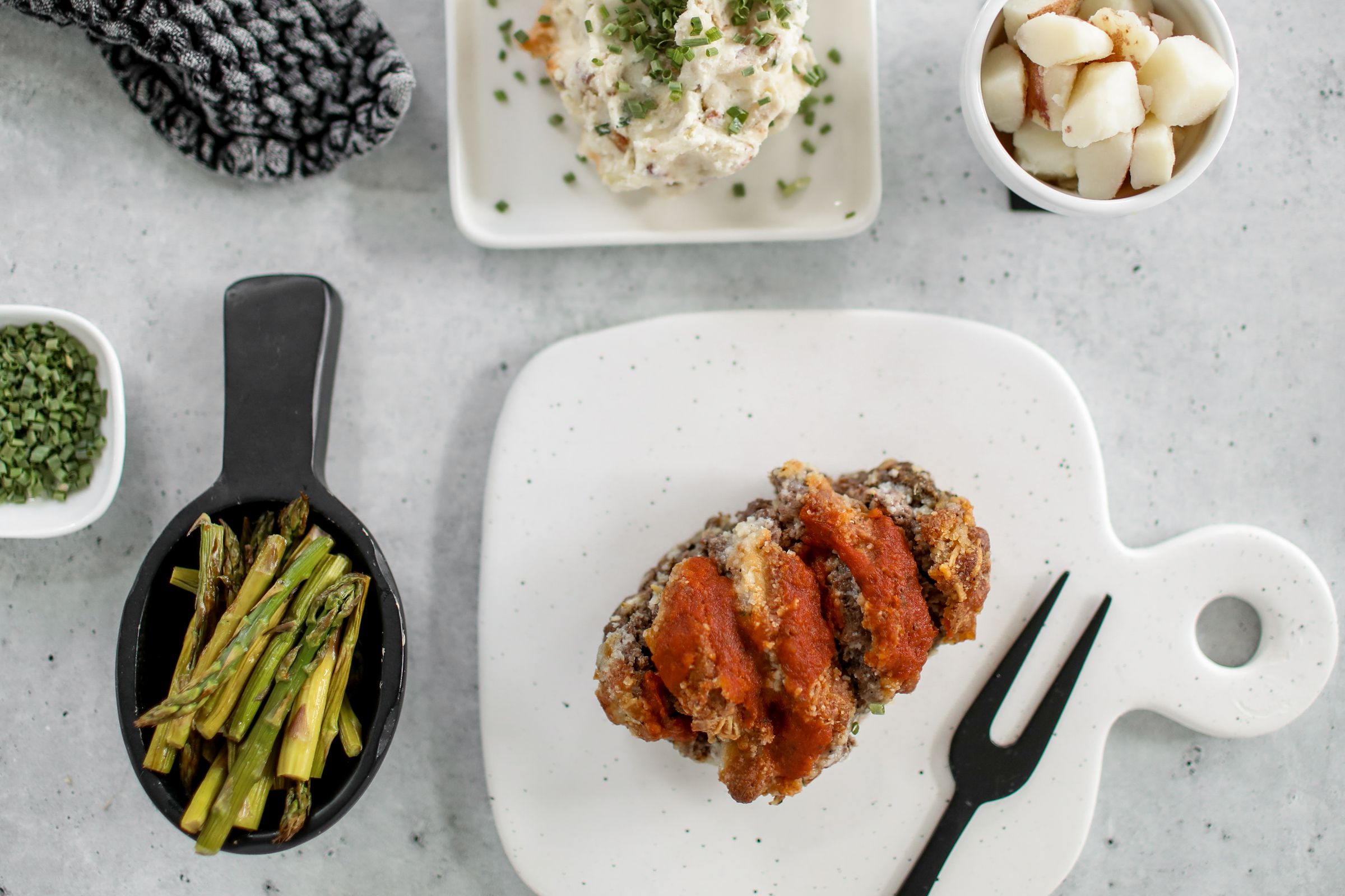 Savor a guilt-free twist on a classic comfort meal with our Parmesan-Crusted Meatloaf! Featuring juicy ground beef with a breadcrumb + cheese mixture, a side of creamy, decadent, mashed potatoes, and crispy asparagus to top it off, this dish is sure to satisfy your comfort food cravings.
