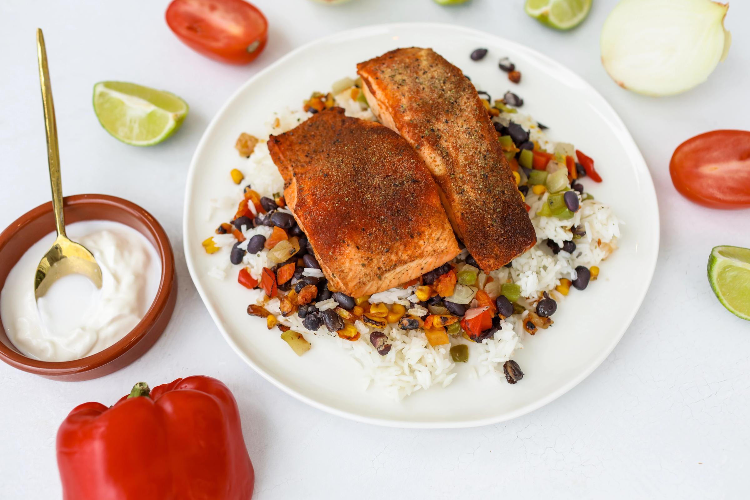 Our vibrant Salmon Taco Bowl features flaky, seasoned salmon over a bed of cilantro rice with corn, black beans, fresh Pico de Gallo, and a tangy lime crema to finish. Bold taco spices, bright citrus notes, and a creamy punch at the end bring everything together for a fresh, satisfying bite!