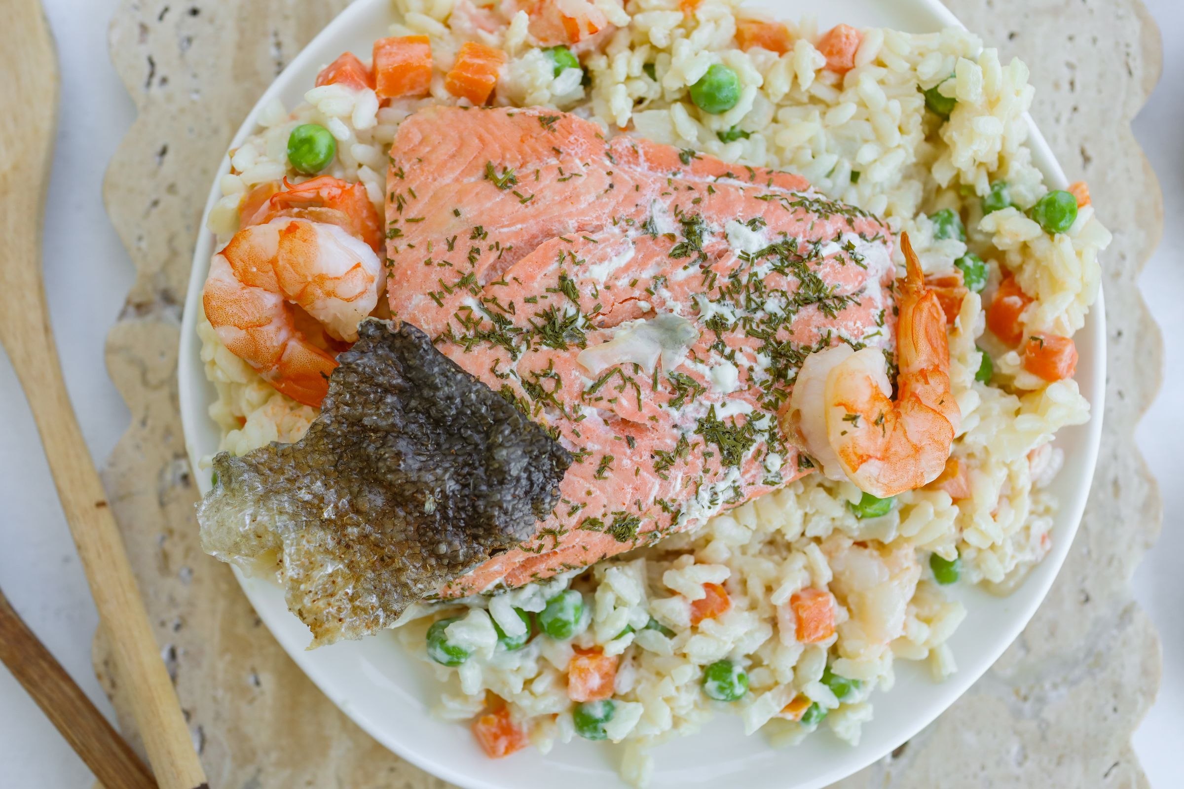 This Exclusive creamy seafood risotto is brimming with tender shrimp (4oz) and succulent salmon (8oz), offering a rich, savory bite in every spoonful. Arborio rice is slowly simmered in a fragrant stock, absorbing layers of flavor while remaining perfectly al dente. Finished with a touch of Parmesan and fresh herbs, it’s a luxurious, flavorful dish that celebrates the best of the sea.