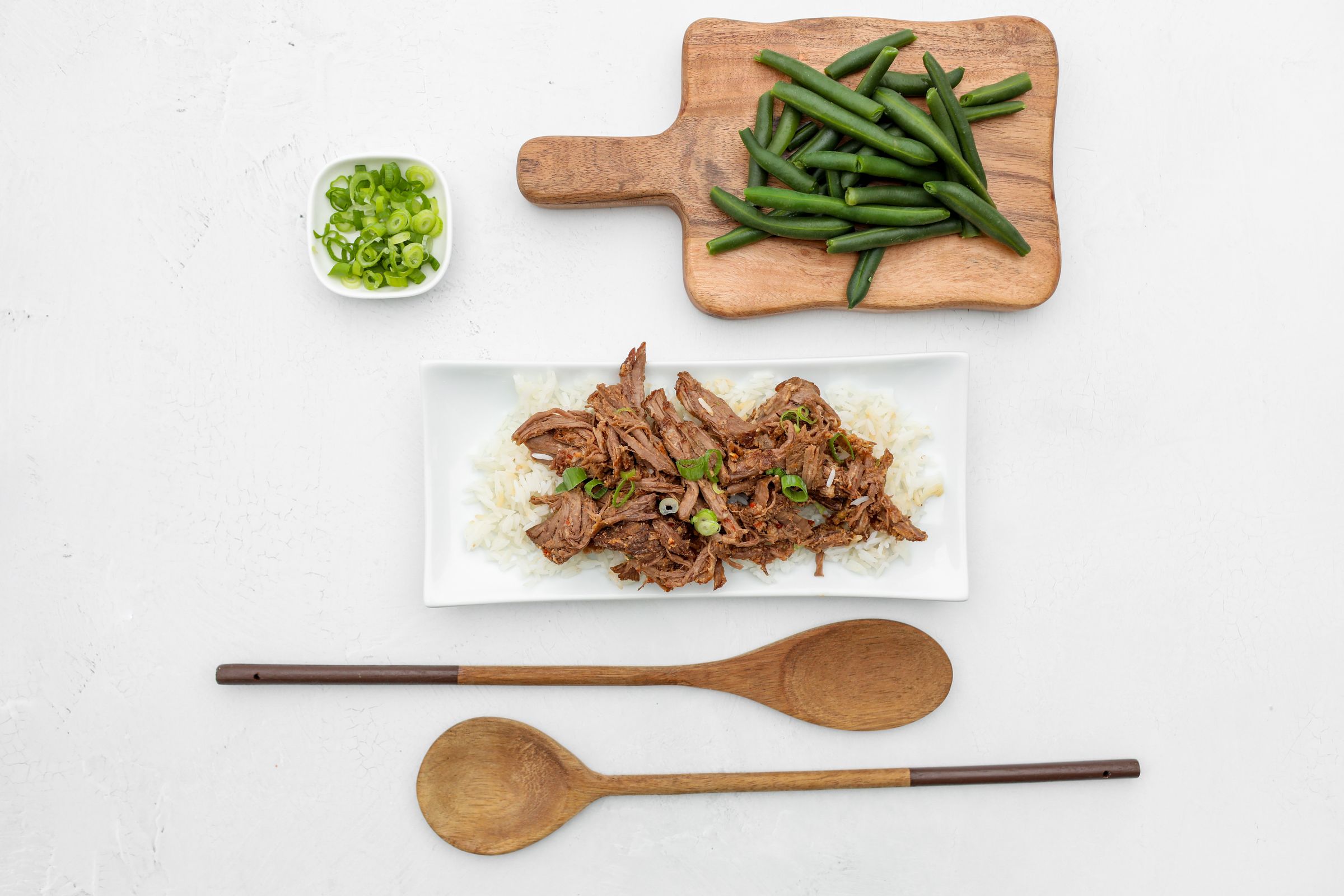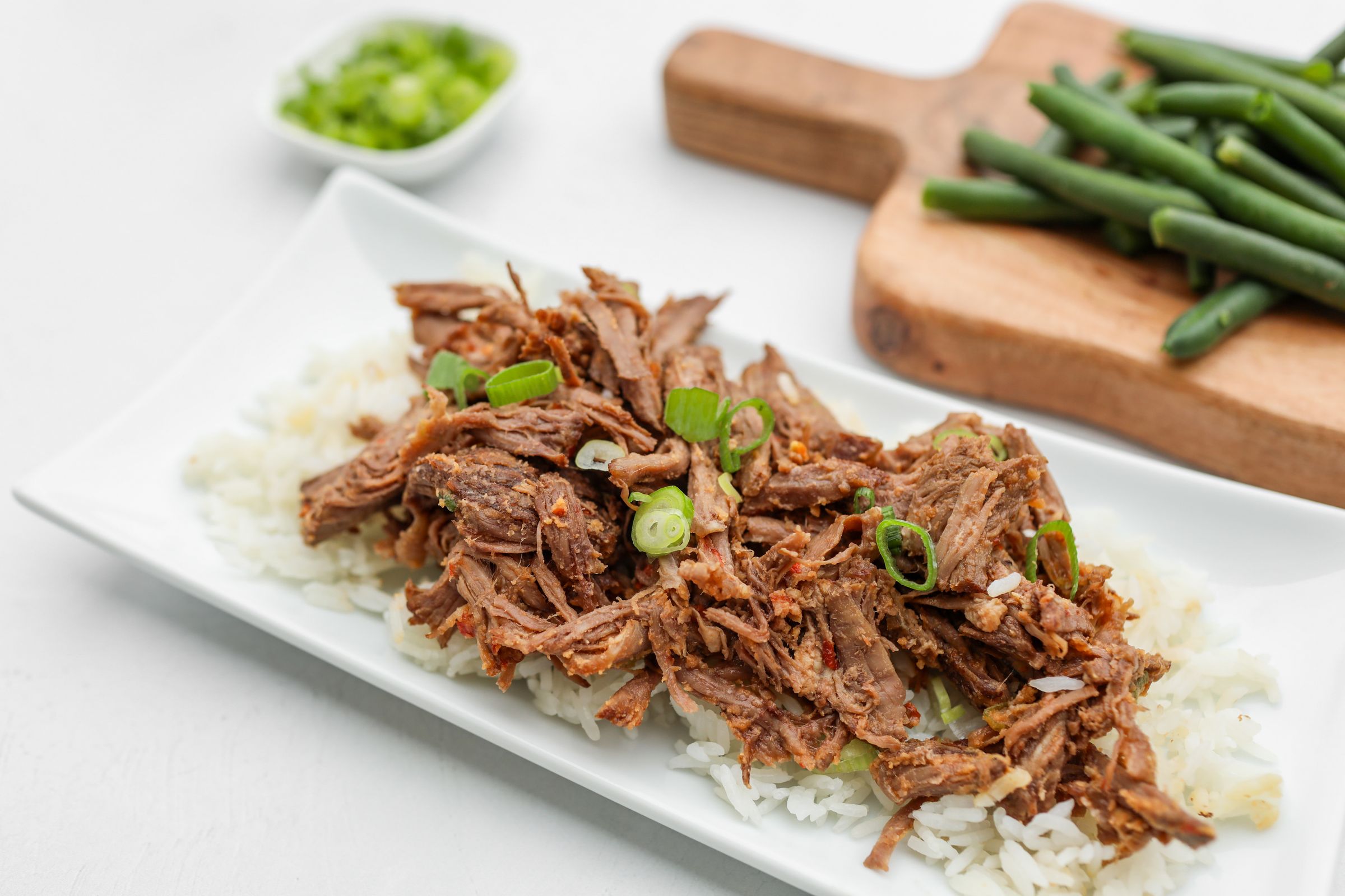 Get ready to meet your new meal prep obsession! This bold and balanced bowl features tender, slow-cooked shredded beef for that perfect sweet-meets-spicy kick. Served with fluffy jasmine rice and crisp green beans, it's finished with a fresh green onion garnish to bring it all together. High protein and high flavor—low effort, no guilt.