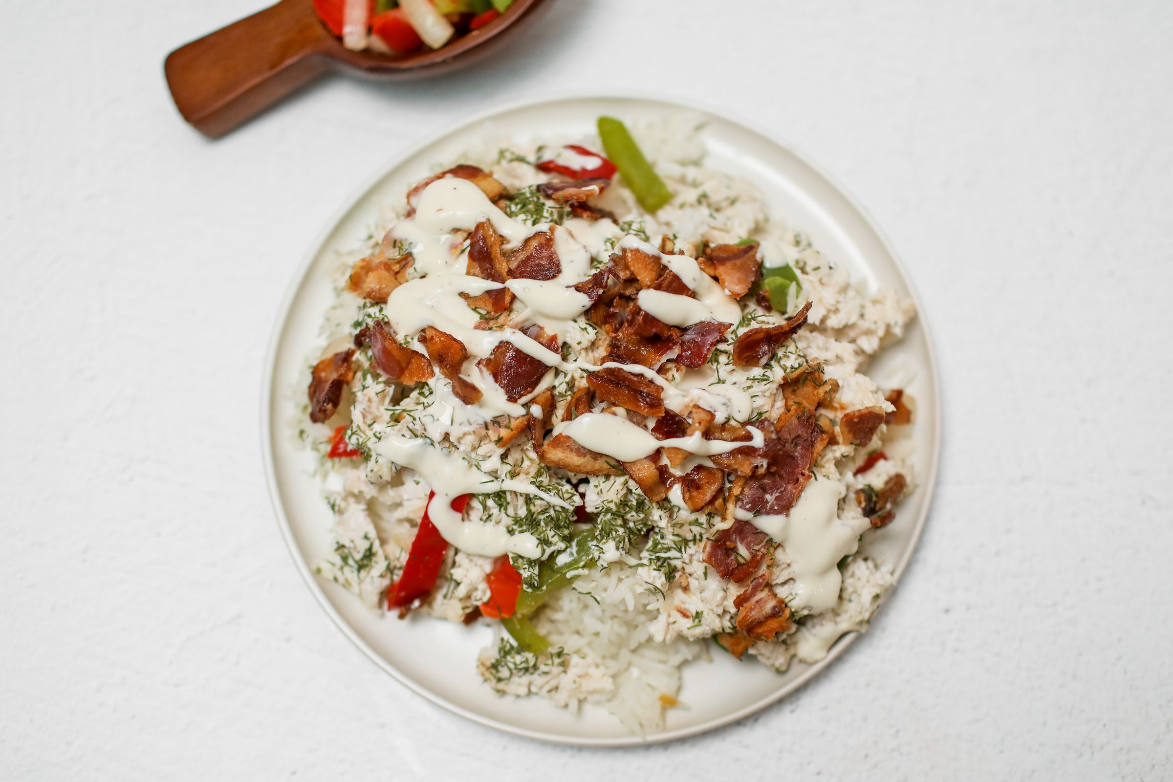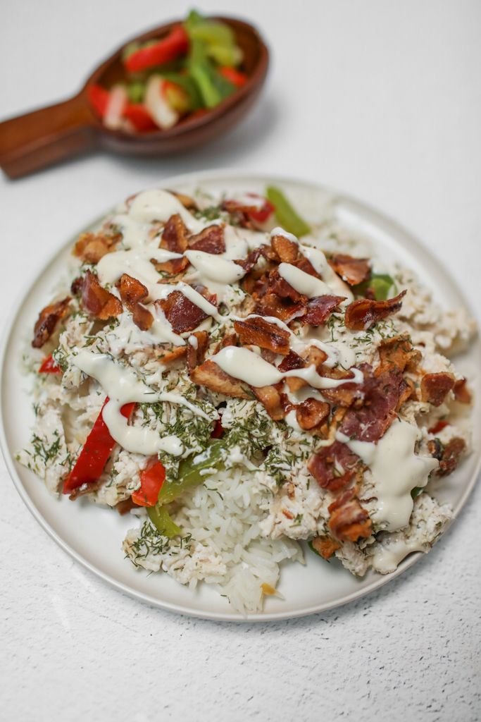 This protein-packed shredded chicken bacon ranch bowl is a flavorful, satisfying meal featuring tender shredded chicken, crispy bacon crumbles, and fresh veggies, all drizzled with creamy low-fat ranch dressing. The combination of smoky bacon, savory chicken, and cool ranch creates a perfect balance of textures and flavors without the extra calories. Great for a quick, wholesome dinner, this bowl is a delicious way to enjoy classic ranch flavors in a lighter, guilt-free way!