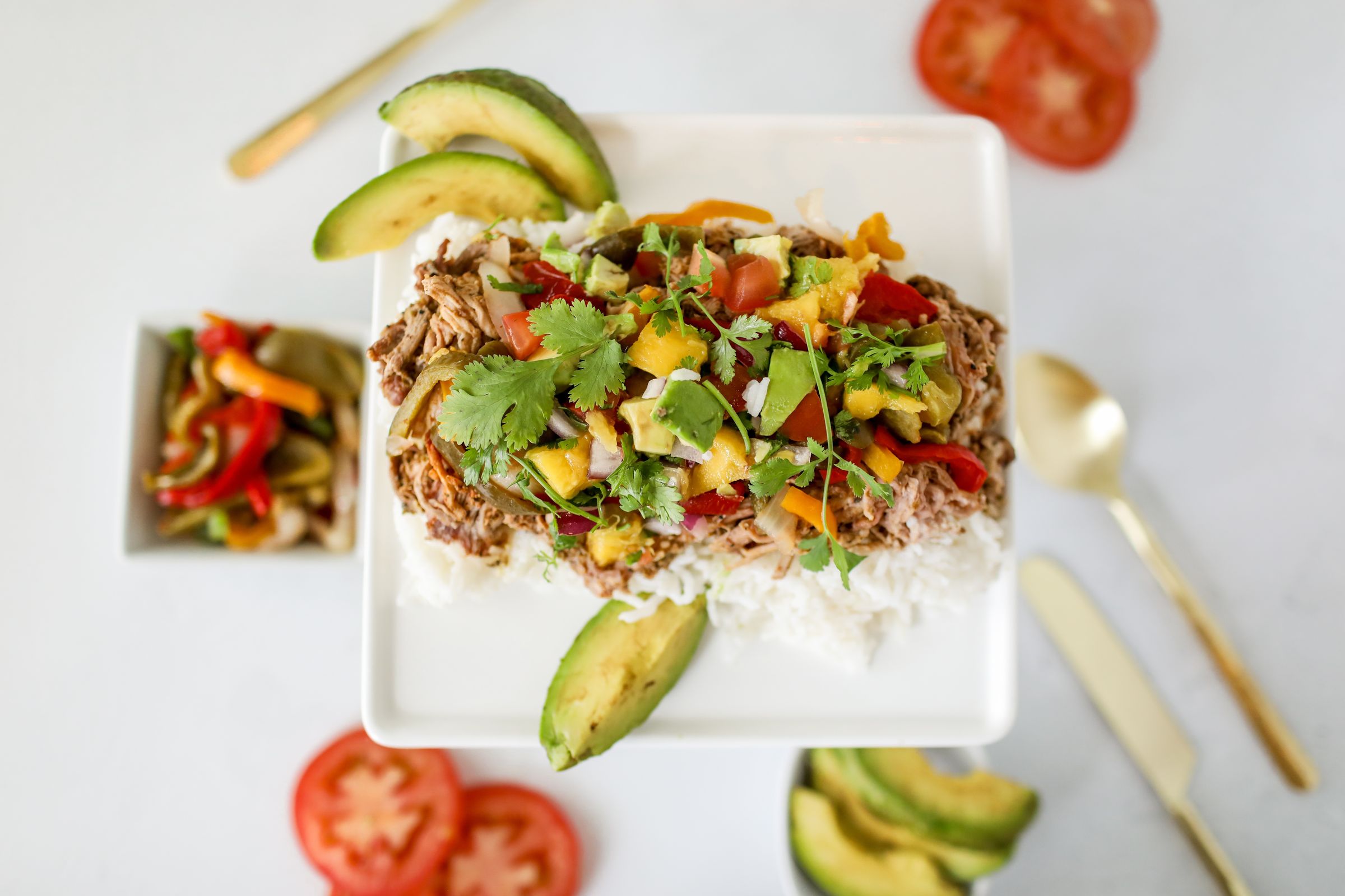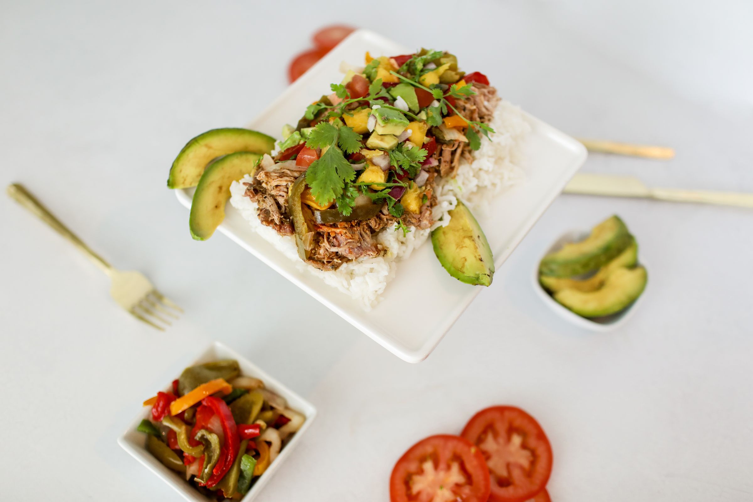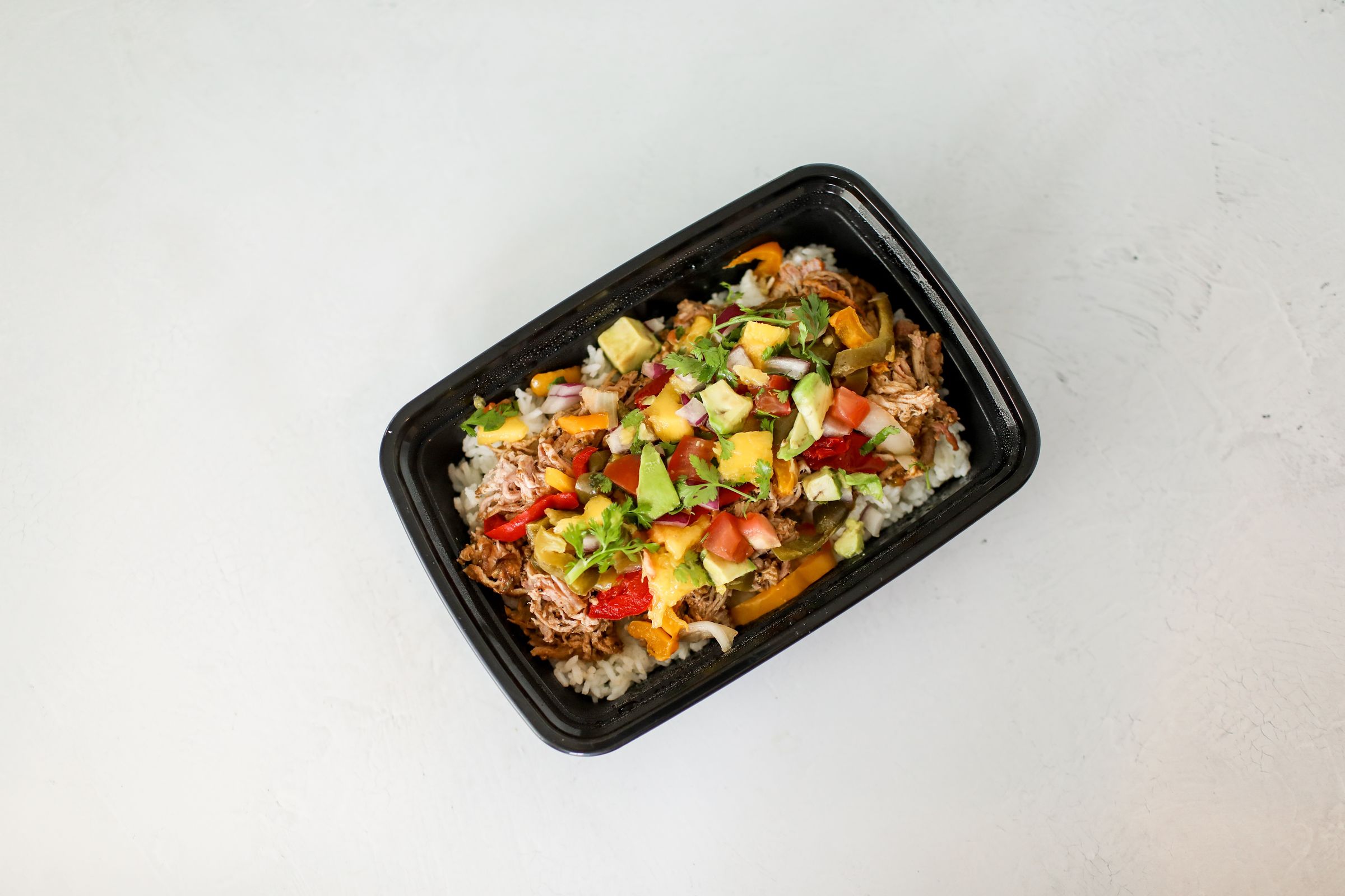 Try our delectable Sweet and Spicy Pork Bowl, crafted with succulent pork simmered in a tantalizing sweet and spicy sauce. Served atop fluffy jasmine rice, a colorful fajita blend of peppers and onions, & topped with refreshing mango Pico de Gallo, each bite offers a harmonious balance of sweet, savory, and spicy goodness. Plus, it’s dairy-free!