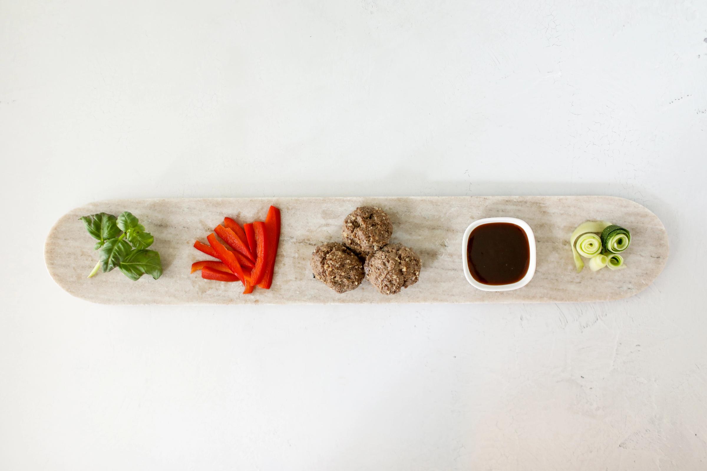 Our savory pork teriyaki-glazed meatballs are served over fluffy jasmine rice with sautéed bell peppers and a sprinkle of toasted sesame seeds for the perfect balance of sweet, savory, and satisfying.