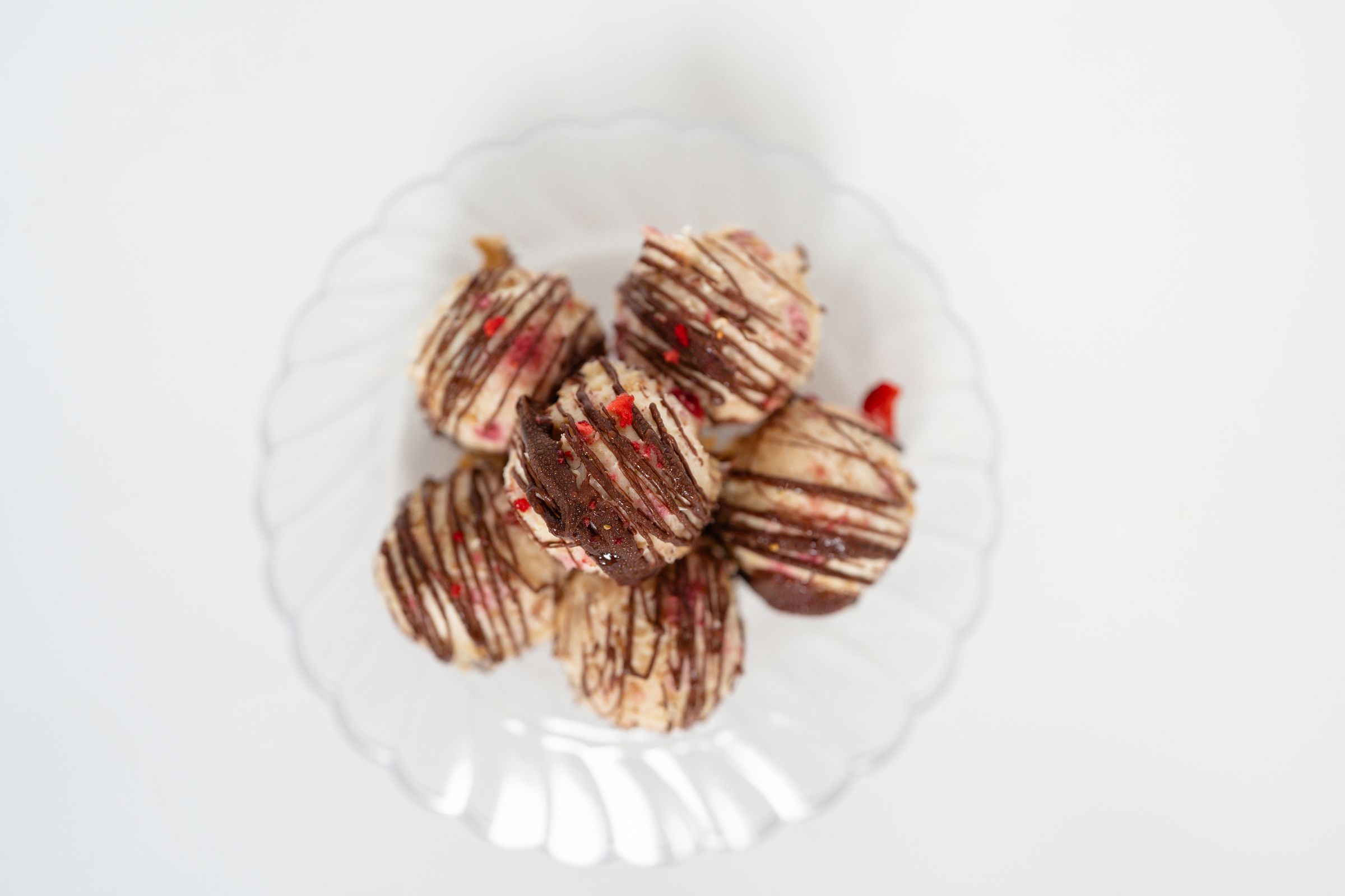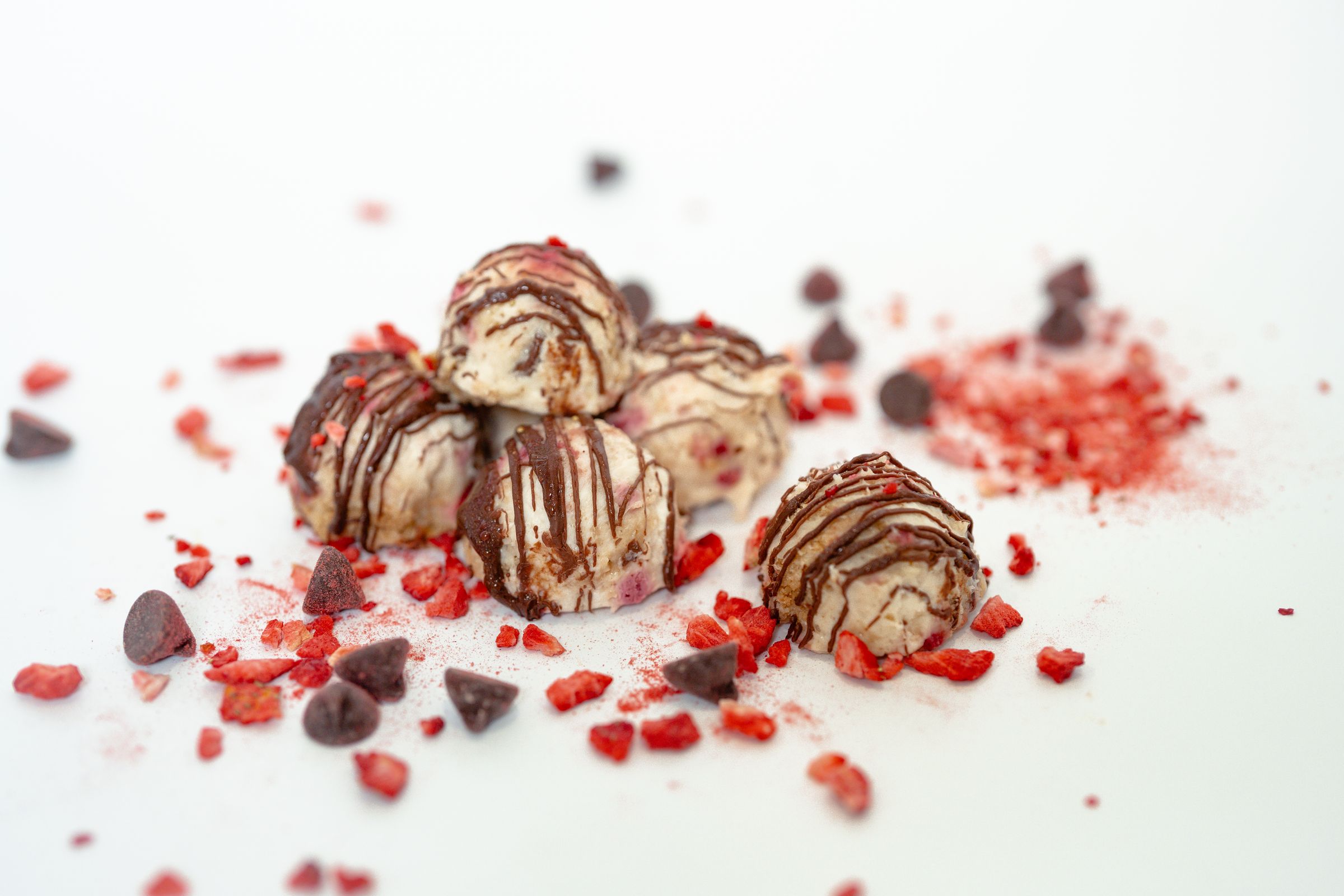 Our Valentine's Strawberry Dark Chocolate Cheesecake Bites are a decadent, bite-sized dessert that combines rich protein cheesecake with the indulgence of dark chocolate and the freshness of strawberries. Each bite is a perfect balance of creamy cheesecake and slightly tangy strawberries, all coated in a drizzle of dark chocolate for an added touch of elegance. *Macros listed are per 1 bite