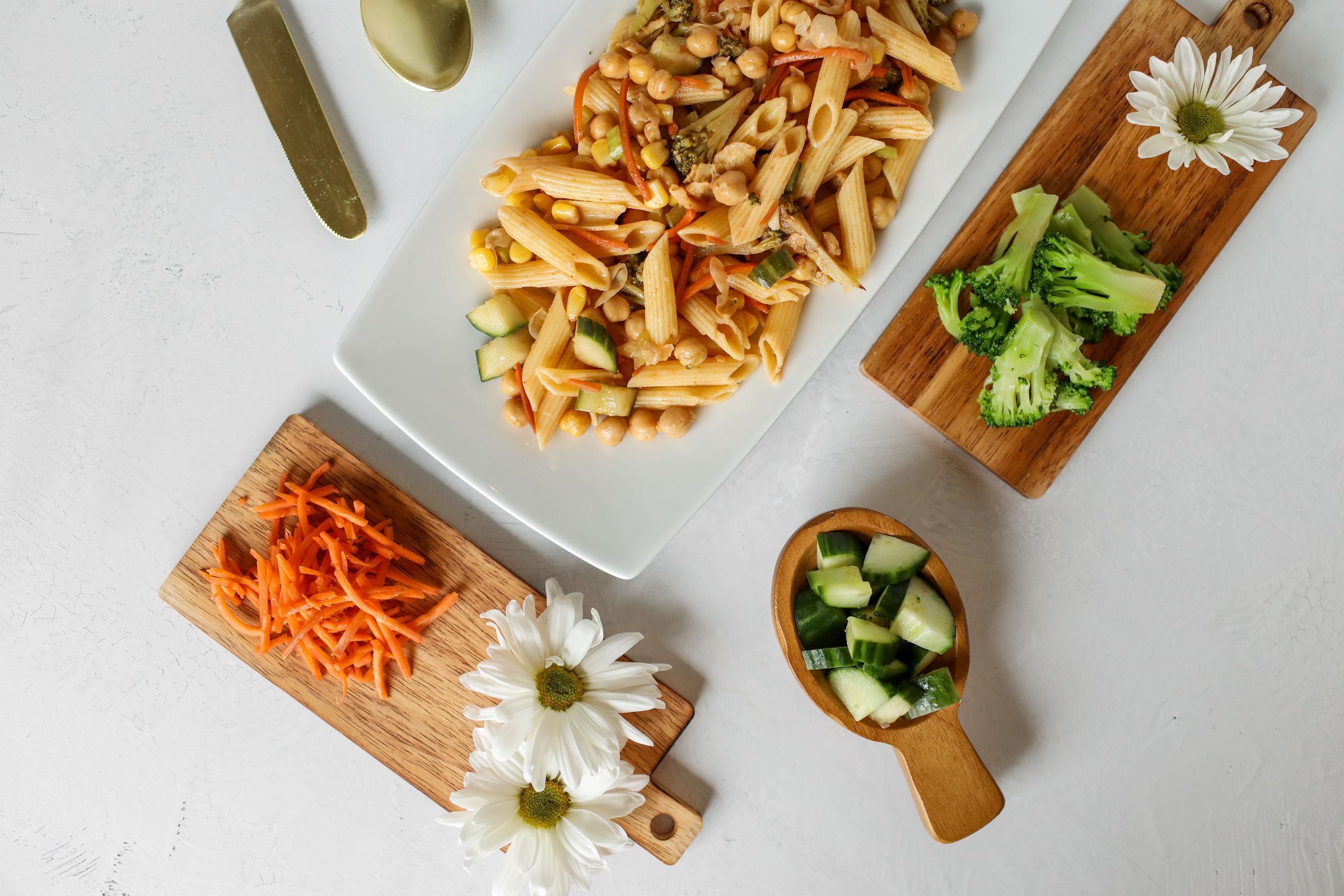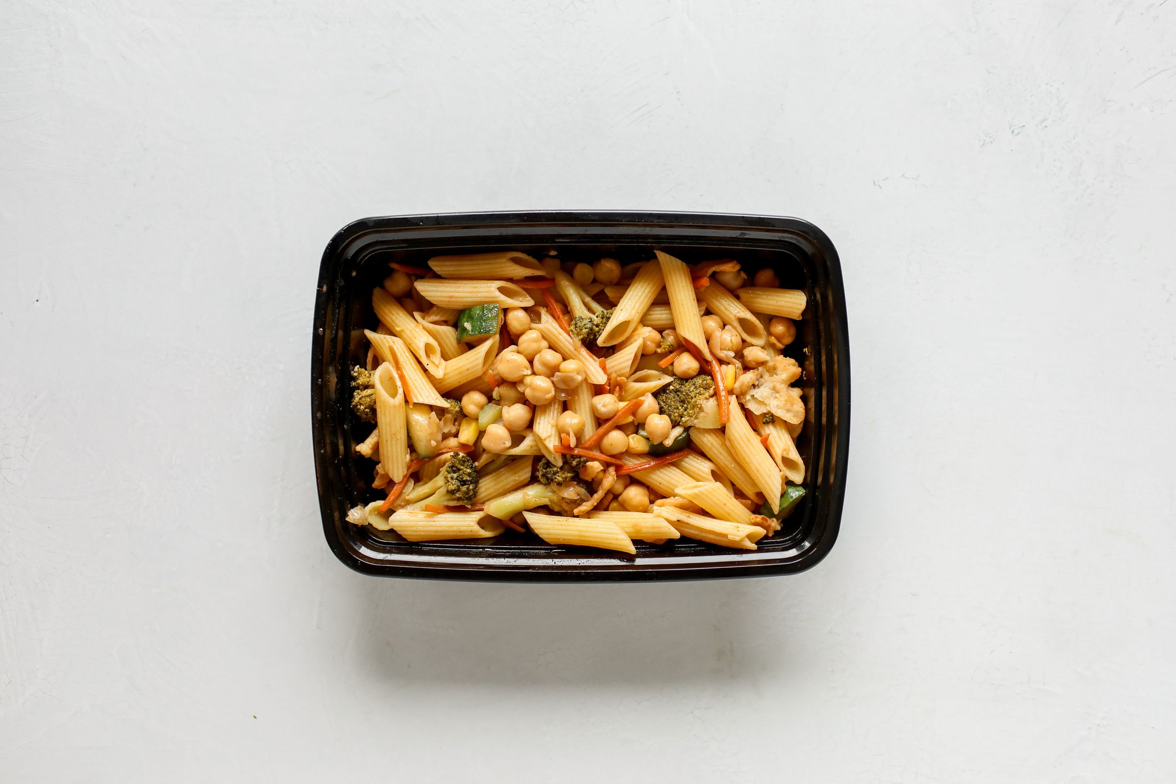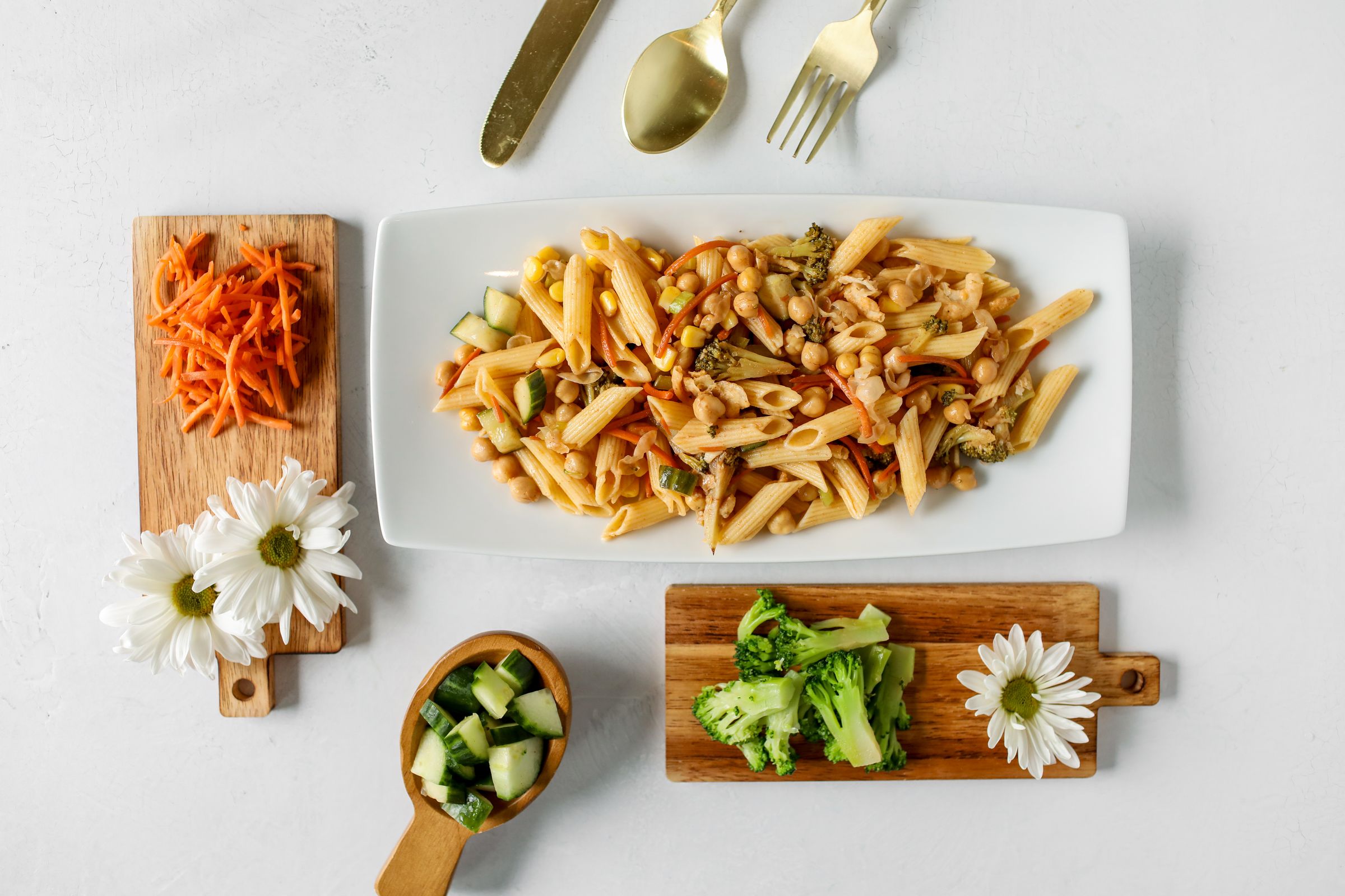 Indulge in our vibrant vegan pasta salad, bursting with wholesome goodness. Delicate penne pasta is intertwined with tender chickpeas, crisp broccoli florets, sweet corn kernels, and vibrant red peppers, all harmonizing in a symphony of flavors and colors. Tossed in a zesty vinaigrette, this refreshing dish offers a delightful medley of textures and nourishment for both the palate and the body.